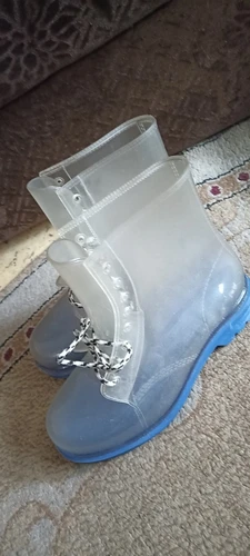 Толстая резина, не легкие, на шнурках. Смотрятся интересно. Размер 37-38.